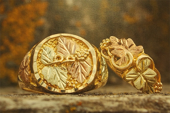 1876年に金鉱が発見されてゴールドラッシュが起きると白人の炭鉱者が殺到、聖地を守ろうとするラコタ族と激しい争いが繰り広げられるようになる。そんな歴史から生まれたのが、このエリアの特産品であるブラックヒルズ・ゴールドだ。特徴はブドウの実と葉をイエロー、ピンク、グリーンの3色で表した彫金細工。当時、グリーンゴールドは世界でも大変珍しく、グリーンゴールドはこのエリアならではとして愛されてきた。