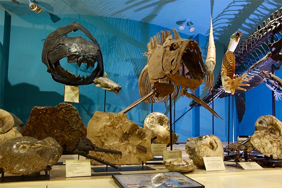 施設内では研究所がこれまでに手がけた恐竜や古生物の化石、その精巧な石膏模型、鉱物標本を見学することができる。