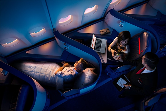 睡眠環境を向上させた「デルタ・ワン」では、ウェスティンホテルがデルタ航空専用に開発した「ヘブンリーベッド」製品の白い掛け布団とダウンタッチピローを採用している。