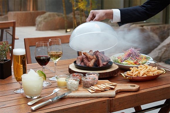そして、選び抜いた新鮮な素材をダイナミックに調理する、6Fのステーキハウス「オーク ドア」では、本場アメリカのバーベキュー料理をシェアスタイルでいただける「サマービアガーデン アンド スモークバーベキュー」を用意。肉を低温で長時間ゆっくりとスモークさせる手法を用いるのが、本場アメリカのバーベキュー。このプランでは、「ホワイトスモーク」社のスモークマシーンを使用し、樫の木でゆっくりと燻製にしたスモークミートを豪快に盛り合わせてサーブする。つけあわせには、バーベキュースパイスフレーバーのフレンチフライが好きなだけいただけるというのもたまらない! ドリンクのフリーフロープランは、フローズンマルガリータ2種、ワイン各種、ビール、サングリアなど種類豊富に揃ったお得な内容になっているので、豪快にバーベキューを堪能するなら、ぜひこちらをチョイスして。