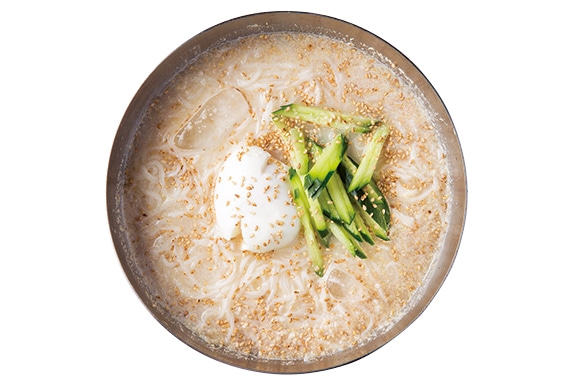 韓国の夏の定番メニューが、この豆乳スープ入り素麺。シモンでは、それを年中味わえる。大豆から作る豆乳の味付けは塩のみとシンプルだが、隠し味の落花生がおいしさの秘密。