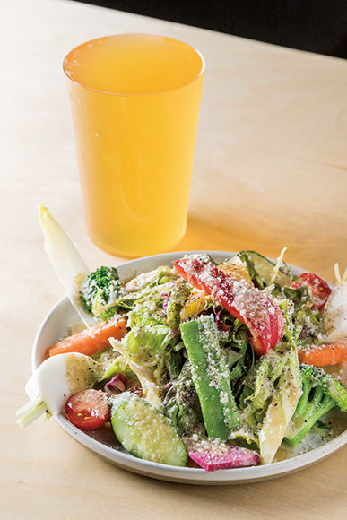 京都の醸造所で作られるセゾンビールは、フレッシュでホップと酸味のバランスも上々。「一期一会」¥1200。合わせるのは9〜10種の野菜を使った「バーニャカウダ サラダ仕立て」¥800