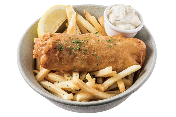 「フィッシュ&チップス」¥1,000。本来はタラなどの白身魚を使うことが多いが、ここではメカジキを使用。繊細な味わいのクラフトビールともよく合う。