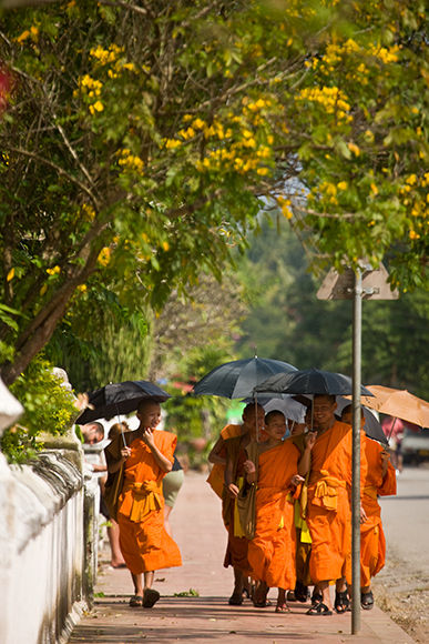 ルアンパバーンの町中で早朝の托鉢を終えた若い修行僧たち。托鉢は町の風物詩。