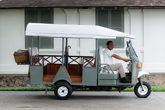 アマンでは、この専用車やトゥクトゥクで町内に行きたいゲストを送り迎え。遠出や飛行場への送迎は高級車で。