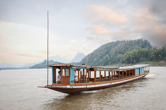 アクティビティとしてメコン川をクルーズするアマン専用のボート。中はとてもゴージャスな造り。