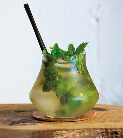 専門店ならではの逸品。ジンで作ったモヒートはスッキリとした味わいが食前酒にぴったり。使用したイタリアのジン、マルコーニはミントのボタニカル(薬草成分)を含んでいるため、統一感のある味に。「ジンモヒート」¥1,512
