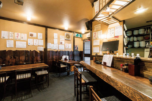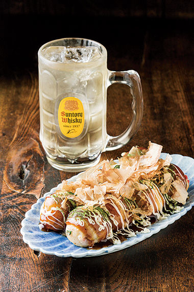 神戸出身のオーナーが開いた、タコ焼き居酒屋。甘口のおたふくソースとかつお節をかけた「ソース」(8個¥756)や「明太マヨ」(8個¥860)など、常時11種類以上が揃うタコ焼きは、焼き色を控えめに付けた関西風。食感をふんわりもっちりとさせるため、生地には牛乳と出汁を多めに使っている。「角生ハイボール」(¥626)をオーダーするのを忘れずに。