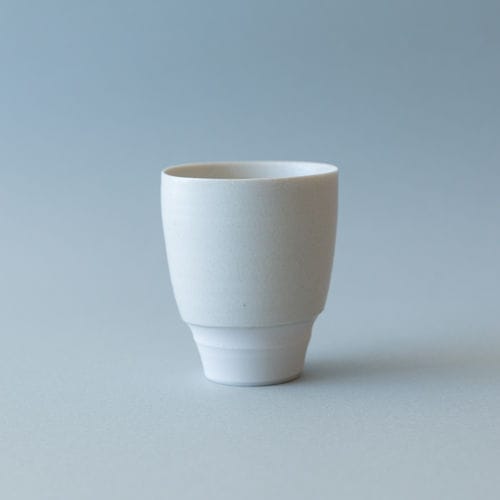 薄い口作りと適度な重さ、ソリッドな形にマットな白が映える。カップ¥3,240/レクトホール