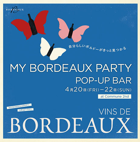 ボルドーワイン、と聞くと高級な赤ワインを思い浮かべる人が多いのでは? 実はボルドーワインには軽快な赤や爽やかな白、ロゼ、クレマン(スパークリングワイン)も充実。そんなボルドーワインを気軽に楽しめるポップアップバー「MY BORDEAUX PARTY」が今週末、4月20日(金)〜22日(日)に表参道で開催!