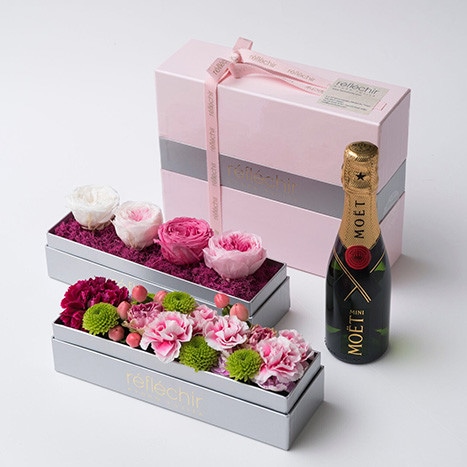 シンプルで上質なフラワーアレンジで、洗練美を追求するレフレシールでは、スタイリッシュなフラワーボックスに、モエ アンペリアルのミニシャンパンを合わせたスペシャルセットに注目。開けてサプライズ! 花とシャンパンという粋な演出は、感謝を伝える日にふさわしい華々しい組み合わせだ。ギフトフラワーボックスは、シャンパンセット以外にも生花やプリザーブドフラワー単体のタイプも揃えてあるので、お好みや用途に合わせてチョイスしたい。