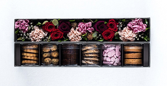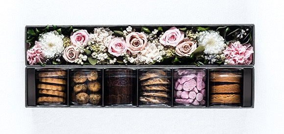 サブレ、フロランタン、メレンゲ、ガレットなど6種類の焼き菓子と、ジジ フルーリストによる華やかなプリザーブドフラワーとのセット。花は、可憐でやさしいパステル調の「ブラン」(上)と、エレガントでシックな「ルージュ」(下)の2タイプから選べる。ともに¥8,600