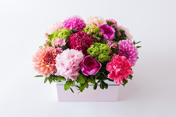 「Mother’s Box B」(限定20個販売)¥13,500(送料込)数色のカーネーションに、バラ、ダリア、トルコキキョウが華やぎを添える、上品で豪華なアレンジメント。