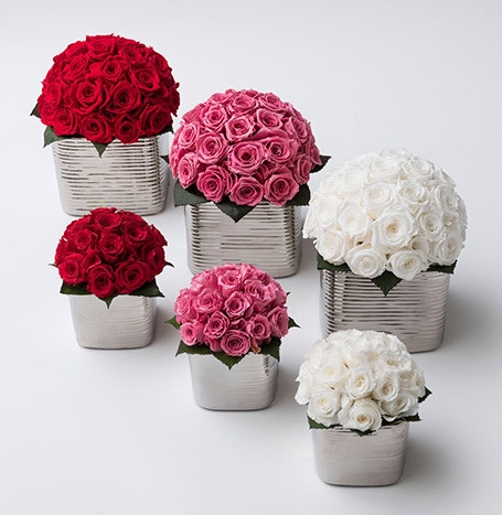 コロンとした愛らしいフォルムで人気の「プリザーブドフラワー NYシリーズ」Sサイズ 各¥9,396、Mサイズ 各¥15,120(すべて送料込) 赤、ピンク、白の他に、黒の展開もあり。
