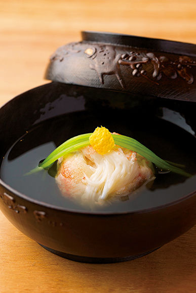 冬の¥8,100のコースより。「カニしんじょのお椀」。山形県産ズワイガニの甲羅も使用したしんじょは、甲羅とお酒の甘味が重なり合い、昆布、生姜の香りも絶妙。梅と鶯のお椀は会津の鉄錆塗り。