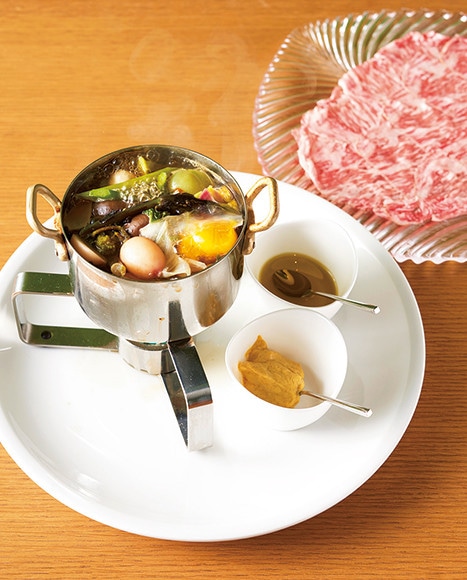 宮城のトマトなど、14種ほどの日替わり野菜を牛コンソメで軽く煮込んだ「冬野菜のポトフ 〜自家製のコンソメで〜」¥1,500。写真は「ポトフでサーロインしゃぶしゃぶ」(プラス¥1,300)を添えたバージョン。野菜から出る出汁とコンソメがよく合う。