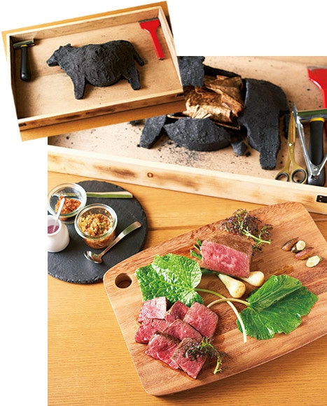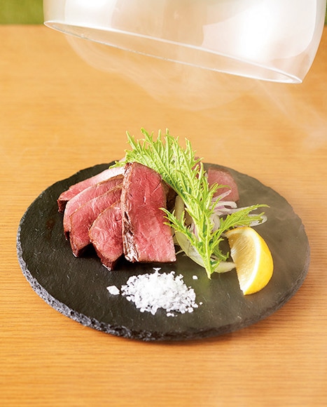 代官山に誕生したヤミーは、牛形に整えられた和牛塩釜ローストビーフや、畑に見立てたバーニャカウダなど、目にも楽しいメニューが豊富。店の人気ナンバーワンでもあるローストビーフは、部位によって銘柄をセレクト。竹の皮に包み、塩釜で覆うことでじんわり優しく肉に火が通り、しっとりもっちりと仕上がる。サクランボやヒッコリーのチップで燻製したハツは、内臓特有の臭みも和らぎ、スモークの香りが食欲をそそるひと皿だ。いずれも楽しいビジュアルとおいしさを見事両立。美味体験を皆でシェアして、目と舌で楽しみたい。