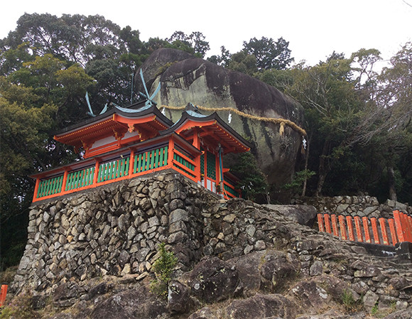 御神体のゴトビキ岩を背にへばりつくように立つ拝殿。高倉下命(たかくらじのみこと)と天照大神が御祭神。