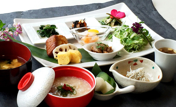 朝食の「薬膳和朝食」の一例。胃にやさしい特製薬膳粥や野菜をたっぷり使った小鉢などがバランスよく盛り付けられている。