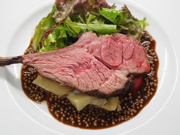 「タスマニア産粒マスタードと赤ワインのソースを添えた仔羊のロースト」