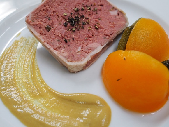 「自家製パテ・ド・カンパーニュ」。マスタードとトマトのマリネを添えて。