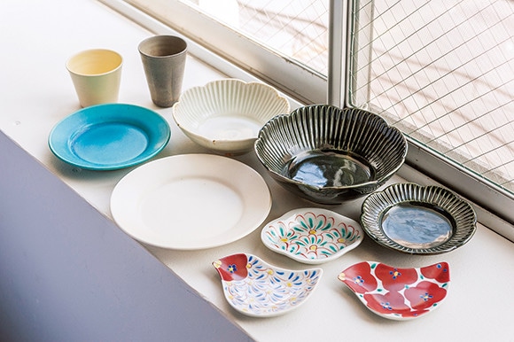 左上から時計回りに、福岡出身の作家でアメリカで活躍するKazu Obaの蕎麦猪口¥3,240、Kazu Obaのビアカップ¥4,320、熊本の女性作家・水谷和音が作る人気の輪花小鉢¥3,024、瑠璃の釉薬を用いた輪花鉢¥3,780、輪花小皿¥1,728、使い勝手のよい赤地径の鳥モチーフ小皿各¥2,700、菊文木瓜の小皿¥2,592、どんな料理とも相性抜群の萩原将之の白い皿¥3,564、鮮やかなトルコブルーの皿¥3,024