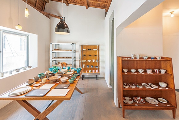 編集者でもあるオーナーが、九州や沖縄をはじめ全国の窯元に足繁く通い選び抜いたうつわが並ぶ。毎日使っても飽きない、料理を引き立ててくれる、軽くて普段使いしやすいことがセレクトのポイント。色鮮やかなトルコブルーの皿や、阿蘇の火山灰を使った釉薬を掛けた片口、小鳥モチーフが愛らしい九谷焼の小皿など、テイストはさまざまだが、洋食器ともなじむ和の食器が豊富に揃う。2カ月に1回ほど企画展も実施。