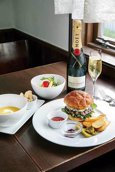 手前から時計回りに、ビーフ100%の「キャラメルアップルとブルーチーズハンバーガー」¥1,200、「バターナッツカボチャのポタージュ」¥900、「ギリシャ風 いろいろ野菜のマリネ」¥800、バランスがよく、あらゆる料理に寄り添う「モエ・エ・シャンドン モエ アンペリアル」ボトル¥10,000