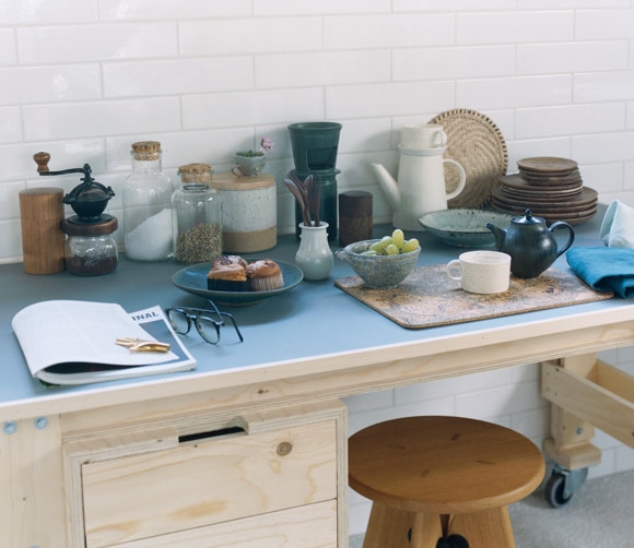 長谷川奈津 » 女性作家らしい柔らかな雰囲気の土もののうつわ。片口¥6,480、円柱型の入れ物の上の猪口¥4,320/以上うつわ楓 ピート・へイン・イークの机¥518,400/シボネ青山 スツール¥73,400/ヴィトラ カール・オーボックのペーパーウェイト¥21,600/プレイマウンテン