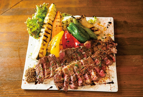 「牛肩ロースと野菜のグリル」。ごろんと大きく切った野菜は、オーナーの父が地元の畑で育てたもの。タスマニア島の粒マスタード添え。写真は2〜3人分¥2680