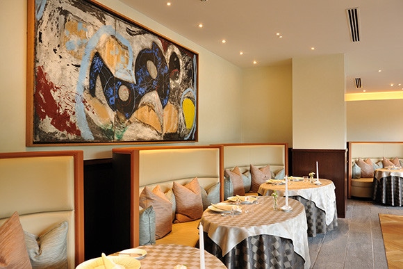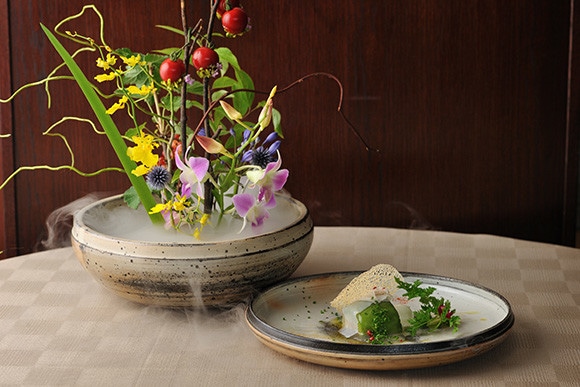 東京フレンチの立役者として知られるひらまつが、おいしい余韻を楽しんでもらいたいと“滞在するレストラン”としてのホテルを開業。館内には、美術館が多い箱根の土地柄を汲んで、シャガールやピカソなど約80点のアートをちりばめた。ディナーも同様、アートや自然との調和を目指した華やかなフルコース。イタリア料理を軸に、ソース使いなどフランス料理の技法を盛り込んだ料理は、ゲストの目の前で仕上げをするなどエンターテインメント性も十分だ。