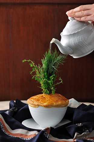 料理はすべて宿泊プランに含まれたディナーの一例。食事のみ利用する際は、¥12,960からディナーコースがある。トマトベースのブイヤベースをパイで閉じ込め、かつお節で取った一番出汁をハーブに伝わせながら加えていく。