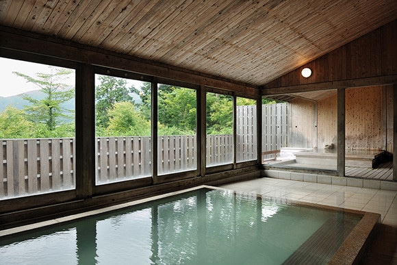 宿泊者限定の温泉施設、バードバス。内湯は大涌谷から引いた源泉、ヒノキの露天風呂は井戸水を利用。