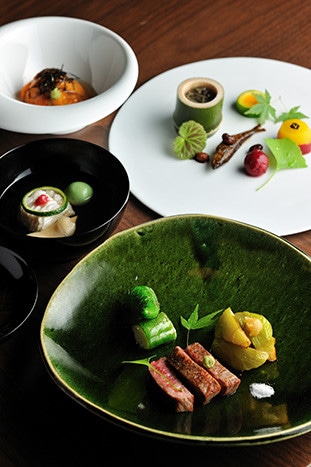 料理はすべて宿泊プランに含まれた俵石閣ディナーの一例。食事のみ利用する際は、¥12,960からディナーコースがある。手前から時計回りに、「和牛のサーロイン」、かつお節と昆布出汁の「ハモのお椀」、「ウニ饅頭」、前菜。