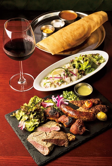 手前から、欧州の食文化が浸透したゴアの豚肉ソーセージなどがのる「石窯スパイシーグリルの肉盛り」¥2,343、レモンとライムでマリネした刺身をパクチーや青唐辛子と和えた「天然カジキマグロのインディアンセヴィーチェ」¥1,058、サンバルとチャトニー付きクレープ「マサラドーサ」¥1,296。グラスワインは¥421からある。