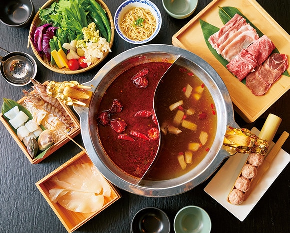 「紅宝石コース」写真は2人前¥16,200。本場より油分と辛味を抑えた麻辣湯スープ(左)と当帰、党参、熟地黄、川芎と4種の漢方が入った肉骨茶スープ(右)の2種類でいただく四川火鍋。具材は、フカヒレのしゃぶしゃぶや日替わりの海鮮5種、黒毛和牛リブロースと牛タンスライス盛りなどバラエティ豊かで目にも楽しい。