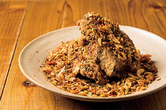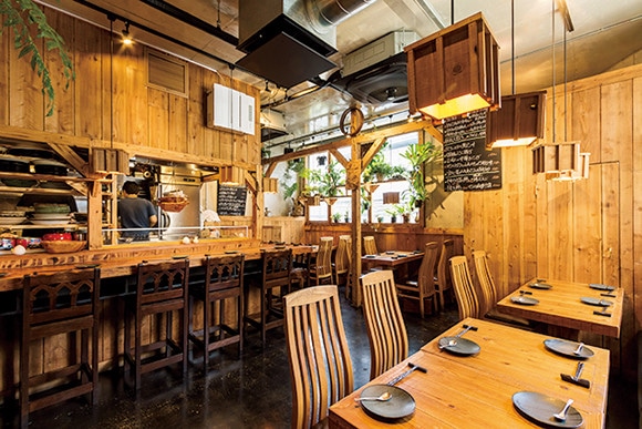 「和牛イチボの山椒ソース」や「アナゴの四川煮込み」などがずらりと並ぶ、黒板の手描きメニューが魅力的な遊猿。オープン1年目にして連日満席の話題店だ。人気の秘密は、ダイナミックかつスパイシーな料理の数々。メニューには載っていないのにもかかわらず、ほとんどの客が注文するのが名物の「湖南風スペアリブ」。ニンニクや唐辛子をブレンドしたサクサクのフレークが、カリっと揚げたスペアリブを覆う豪快な逸品。アラカルトで自由に楽しめるのもうれしい。
