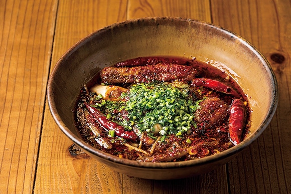 「アナゴの四川風煮込み」¥2,041。揚げたアナゴを、オイスターソースと刻んだ豆豉や干しエビ、唐辛子で作る香辣醬で煮込んだ人気料理。辛さの中に甘味が広がり、ご飯が欲しくなる味。