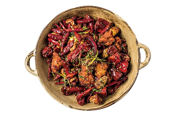 朝天唐辛子と鷹の爪が満載の四川風鶏の唐揚げ。パンチの利いた香りが食欲をそそる「辣子鶏」¥1,814