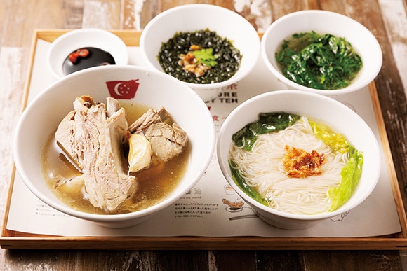 シンガポールの街角に、多くの専門店が並ぶ肉骨茶。朝食に食べたいあっさり味、コショウが利いた濃厚タイプなど店によってさまざまなタイプがあるが、こちらは比較的マイルドな味わい。十種以上の漢方を1mg未満の単位で調合したスープが、夏バテ気味の身体にじんわりと沁みる。