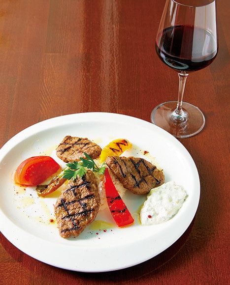 「キョフテ」¥2,268。トルコ人のルーツであるタタール人に好まれたタルタル(タタール)ステーキを起源に持つ肉料理。トマトやガーリックを使ったヨーグルトソースを合わせてさっぱりと。ワインはグラス¥810〜
