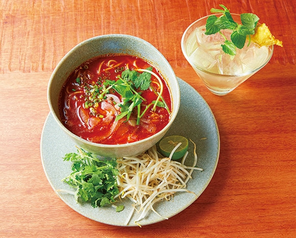 南国のリゾートホテルを思わせる 空間で、モダンなタイとベトナム料理が堪能できるニューカマー。数あるメニューの中でも刺激的なスパイス体験を楽しみたいなら辛口の「ブン・ボーフエ」をオーダー。鶏ガラベースのスープにレモングラスと唐辛子をブレンドしたオイルを加え、辛味と旨味を出した麺は、やみつきになるおいしさ。