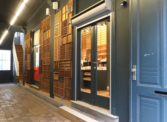 ブティックのエントランス。入る前に活字収納枠を使った通路の壁の装飾もぜひ見て。