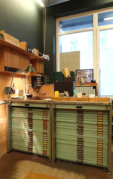 ブティックと同じ建物にある工房では、19世紀の機械でいまも活版印刷の作業が進められている。