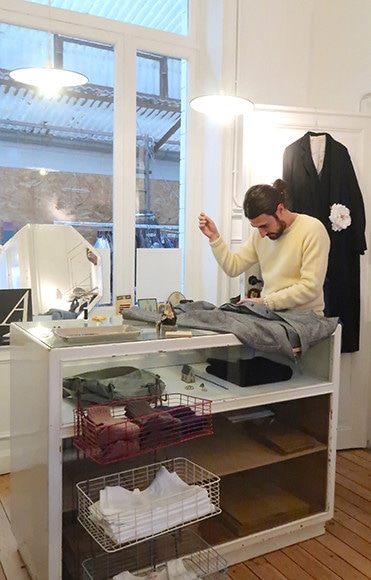 ブティックの奥で作業するユーゴ。