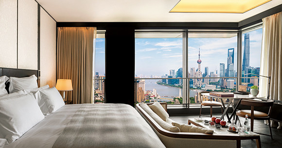 黄浦江と上海の中心街を見渡すプレミアムバンドビュールーム。