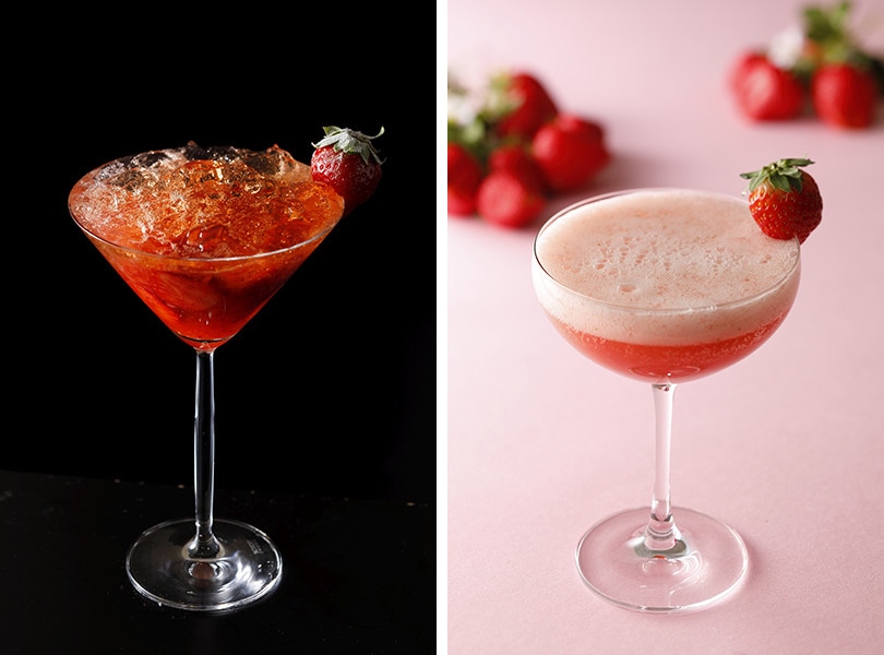 左:酸味と甘みの絶妙なバランスが喉を潤す「プレミアム ストロベリー カクテル」¥3,900 右:マリアージュを優雅に堪能する「シャンパーニュと3種の苺」¥2,900(ともに税・サービス料別) ※期間:開催中~4月26日(金)