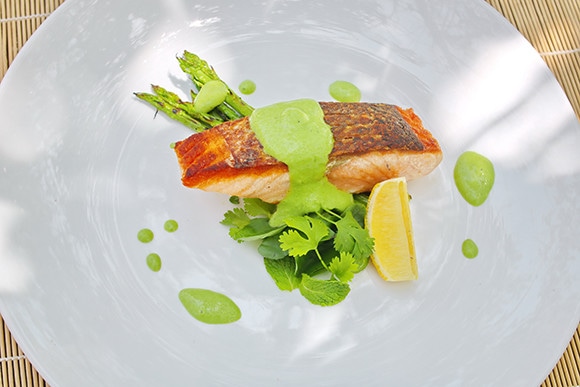 世界のさまざまな国のホテルのシェフが、家でも作れるホテルの味を伝授する短期連載「お家で作る世界のホテルのレシピ」。第4回はベトナムのビーチリゾート、シックスセンシズ ニンバンベイから、ハーブをふんだんに使ったグリルサーモンとサラダの2品を紹介。