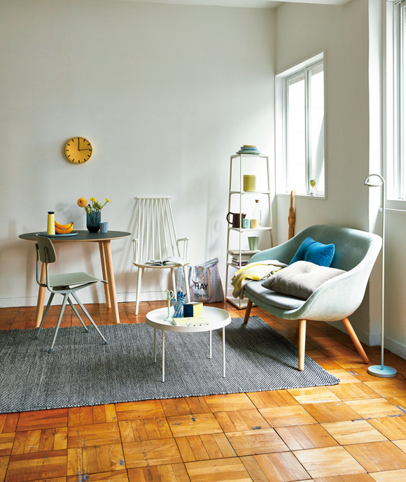 HAYならではの色使いを駆使して、部屋をカラフルに遊ぶ。壁際の丸形テーブル(φ98×H73㎝)¥97,200 同テーブル上:ダスティブルーのトレイ¥9,180、レモンイエローの水筒¥6,048、花を生けたガラスの花瓶¥12,852、底が十三角形になったマグ¥5,940 壁にかけた時計¥17,172 インダストリアルなグレーの椅子(W45.5×D48.5×H81㎝)¥42,120 モノトーンのシックな手織りキリム(170×240㎝)¥75,600 白い椅子(W53×D60×H106㎝)¥42,120 白いローテーブル(φ55×H35㎝)¥28,080 同テーブル上:ミントグリーンの自立式ハサミ¥2,700、鉛筆各¥540、鉛筆立てにしたグラス¥972、ノート(イエロー系)(ドット)各¥1,080、キューブ状のメモパッド¥3,132 壁際のロゴ入りトートバッグ¥1,620 エッフェル塔をイメージした細長いラック(W52×D52×H145㎝)¥72,360 ラック内:上から、5色展開のボウル(ライトイエロー)¥1,836、落ち着いた色みのマーブルプレート(小)¥2,700、(中)3,240、(大)¥3,456、HAY×ソノスの高音質ワイヤレススピーカー(限定色・ペールイエロー)¥30,024、黄色い蓋がアクセントの茶色いコーヒーポット¥14,256、マグカップ各¥2,700、透明のガラスボトル¥4,860、マットな質感のフラワー形ベース¥12,960 ベロアのバイカラーソファ(W156×D73×H81㎝)¥324,000 ソファ上:蛍光イエローが利いた100%メリノウールのブランケット(140×180㎝)¥36,720、ベロアのクッション(ブルー)(グレー)各¥13,824 窓際:傘¥6,264、洗練された形と配色のガラス製砂時計¥3,456 ミニマルなスタンド式フロアランプ¥50,760/以上ヘイトウキョウ その他/スタイリスト私物