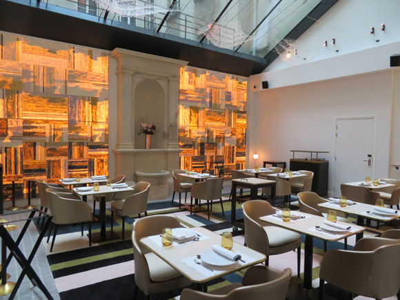「ル・グラン・カフェ・フォション」は昼と夜とで壁のライティングが変わり、まったく別の空間に。朝食、ランチ、ティータイムに利用。